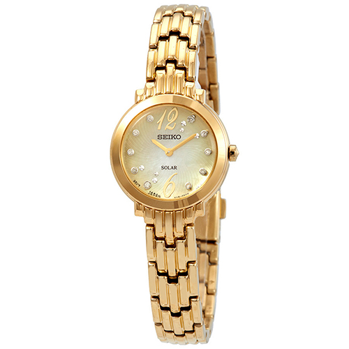 Yellow gold tone stainless steel Tressia Seiko watch. This 24mm quartz watch features a Mother-of-Pearl diamond dial. Solar powered by light energy.