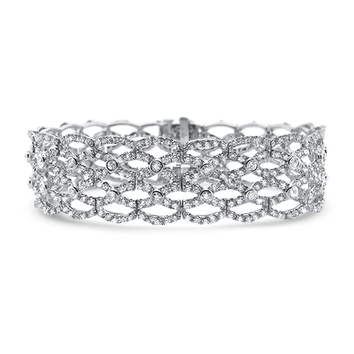 This 14kt white gold wide basket weave diamond bracelet features 560 round diamonds totaling 9.50ct and measures 7 inches long and 0.75 inches wide. A stunning weave of round brilliant diamonds will make a beautiful statement for your next black tie event.