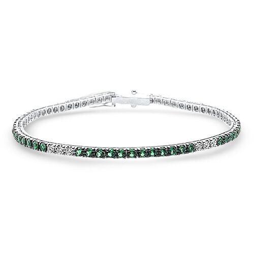 This 18kt gold white gold stunning tennis bracelet features 59 round tsavorite garnets totaling 2.31ctw, 12 round brilliant diamonds totaling .35ctw and measures 7″ in length.