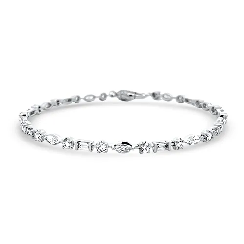 This 18kt white gold multi shape diamond line bracelet features 44 round brilliant diamonds, 9 marquis diamonds and 8 baguette diamonds totaling 2.42ctw, a pave diamond lobster clasp and measures 6.75″ in length.