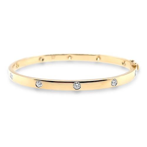 This 14kt yellow gold bangle has a classic look and features 10 round diamonds totaling approximately 1.20ctw.