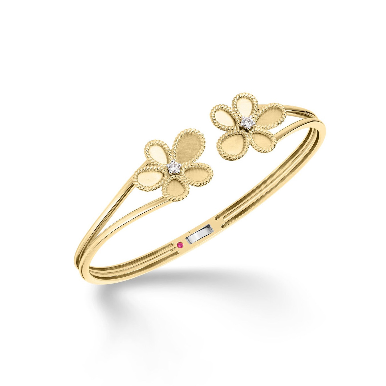 This 18kt yellow gold Roberto Coin Jasmine flower bangle features two round brilliant diamonds totaling .08ctw and a hinged closure.