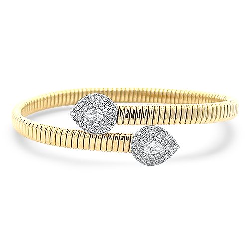 A graceful look for your bracelet stack. Our 18kt yellow gold Italian-made cuff bracelet shines in a striking bypass design with two pear shape diamonds in stunning double diamond halos totaling 1.10ctw.
