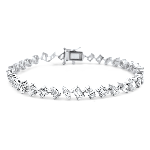 This 14k white gold diamond line bracelet features 36 multi-shape diamonds and measures 7 inches in length. With 8 pear shape, 7 marquise, 7 emerald cut, 7 oval and 7 round diamonds totaling 6.60ctw this bracelet is a stunner!