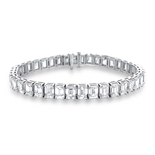 This platinum prong set diamond bracelet features 40 stunning emerald cut diamonds totaling 28.31ctw and measures 7.25″ in length.