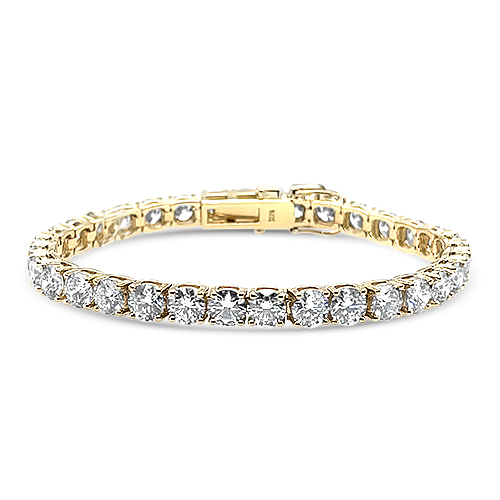 This 14kt yellow gold diamond tennis bracelet features 33 round brilliant diamonds totaling 17.68ctw and measures 7″ in length.