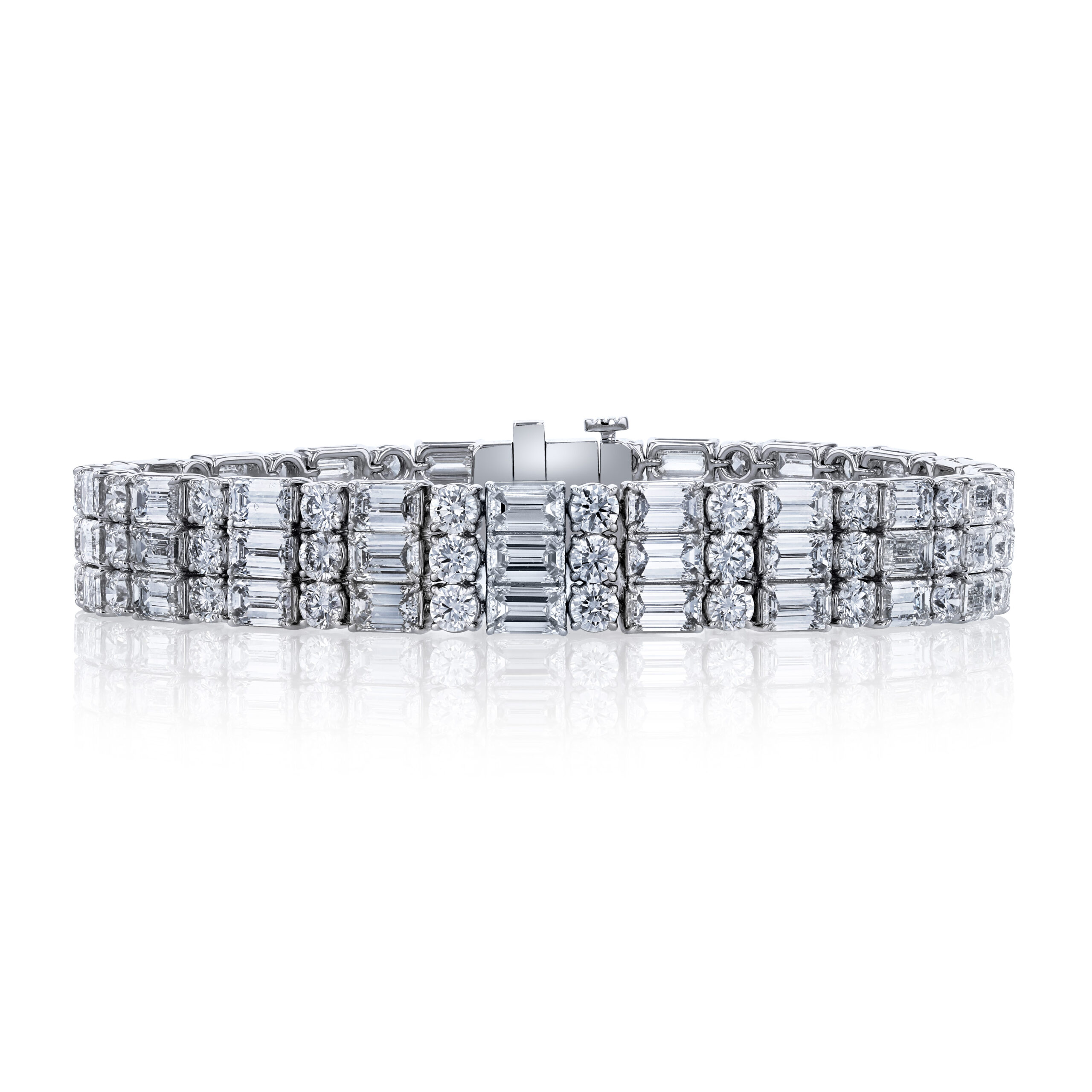 This stunning platinum, 3-row diamond line bracelet features 63 emerald cut diamonds (totaling 19.61ctw) and 63 round brilliant diamonds (totaling 8.80ctw) and measures 7 inches in length by 10mm in width. The diamonds are laid out in groups of three and alternate in rows of brilliant cut and step cut giving an incredible optical illusion. It’s a true beauty! All the diamonds have been graded by our in-house AGS and GIA certified graduate gemologist and average G to H in color and VVS1 to SI1 in clarities.