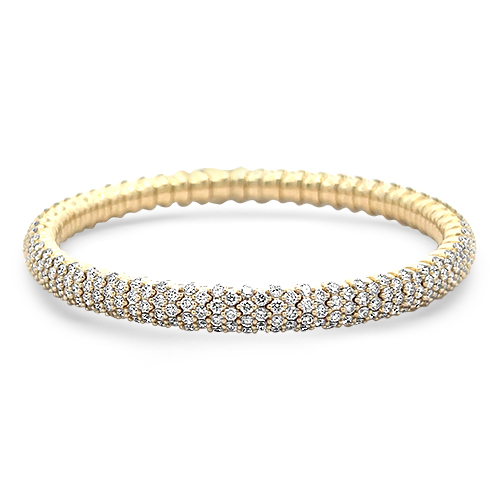 Make a statement with this 18kt yellow gold stretchy diamond bangle featuring 385 round brilliant diamonds totaling 6.50ctw and measures 6.75″ in length.