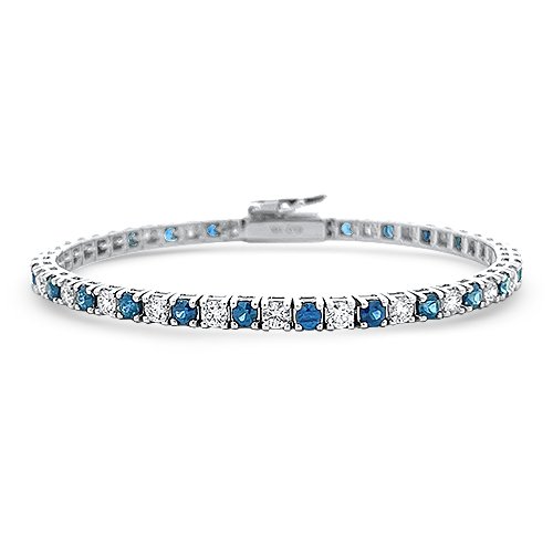 This 14kt white gold line bracelet features 52 alternating sapphires and diamonds totaling 5.34ctw and measures 7 inches long.