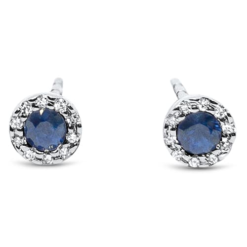 14kt. white gold dark blue sapphire and diamond halo stud earrings. The dark blue sapphires at .30ct.t.w. are surrounded by 20 accent diamonds at .06ct.t.w. The studs measure approximately 1/8″ and are a beautiful understated yet colorful stud earring.
