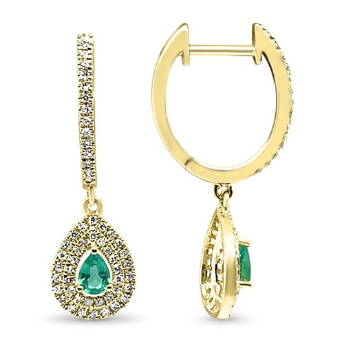 The sparkle factor is here on these 14kt yellow gold .33ctw double diamond halo earrings features two pear shape emeralds totaling .30ctw.
