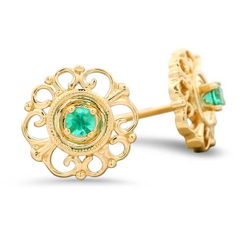This pair of 14kt yellow gold filigree floral studs features two round emeralds totaling .09ctw.