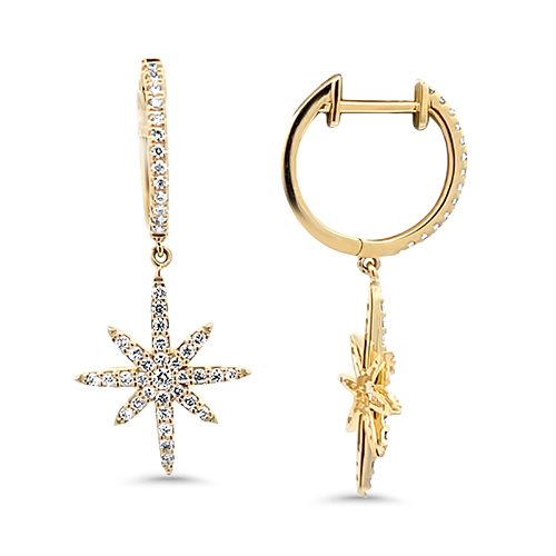These 18kt. yellow gold drop earrings have a distribution of 86 diamonds, totaling 0.60ctw. The diamonds form a star and cover the huggie earring. Measure 1.25″ long.