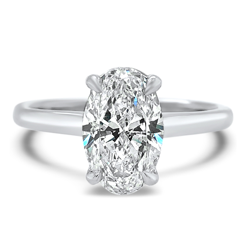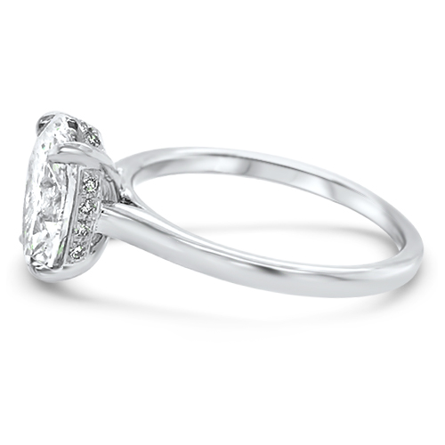 This platinum solitaire engagement ring features a 1.70ct oval diamond, graded by the AGS and GIA Laboratories to have an Excellent cut grade, F color and SI2 clarity, mounted in a hidden diamond halo (18 round diamonds totaling 0.09ct), flush-fit ring mounting. The perfectly clean and simple, yet stunningly brilliant diamond enagement ring!