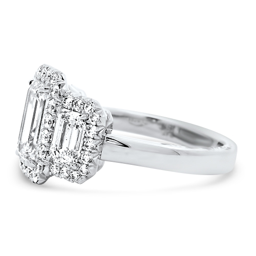 This remarkable platinum 3 stone diamond ring features 3 emerald cut diamonds totaling 2.50ctw accented by three diamond halos totaling .50ctw. The center stone has been graded by our in house certified gemologist to have excellent cut grades, I color and VVS1 clarity. The side stones have excellent cut grades, H colors and VVS2 & VS1 clarities.