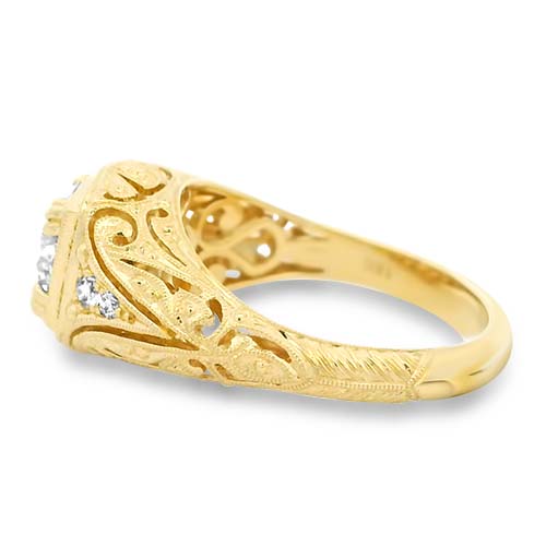 This remarkable 18kt yellow gold filigree engagement ring features a center 1.41ctw round brilliant diamond accented by a graduated bead set diamond shank. The center stone has been graded by our in house certified gemologist to have an ideal cut grade, J color and VS1 clarity.