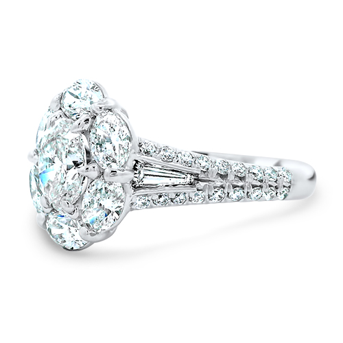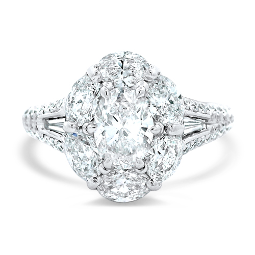This JB Star designed engagement ring features a center 0.80ct oval diamond (graded by the GIA to have a G color and VS2 clarity) with 6 oval diamonds surrounding it in a halo (totaling 1.20ctw), 2 tapered baguette diamonds (0.21ctw) in the ring shank along with 36 round brilliant diamonds (0.33ctw) decorating the shank half-way around.