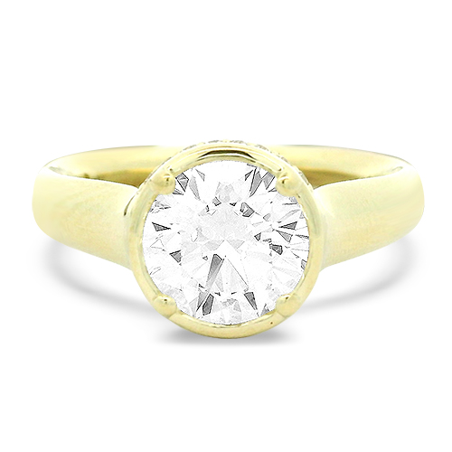 This 18kt yellow gold engagement ring features a center 1.68ct bezel set round diamond accentuated by a diamond belt and a flush fit shank. The center stone has been graded by our in house certified gemologist to have an ideal cut grade, J color and VS1 clarity.