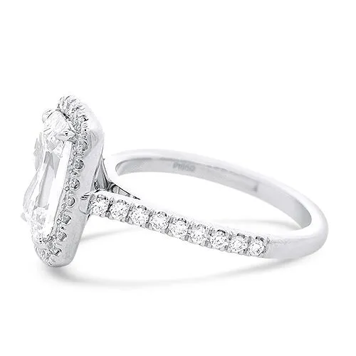 This beautiful platinum engagement ring features a center 2.01ct elongated cushion cut diamond accentuated by a halo of round brilliant diamonds and a flush fit diamond shank totaling .39ct. The center stone has been graded by our in house certified gemologist to have H color and SI1 clarity. In addition, this diamond is eligible for our grow a diamond program.
