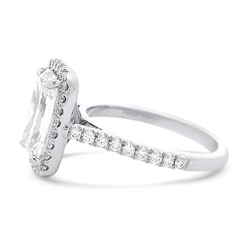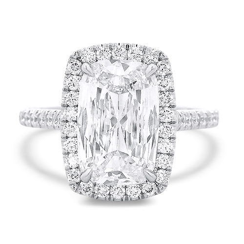 This platinum engagement ring features a center 2.13ct elongated cushion cut diamond accented by a halo of round brilliant diamonds and a flush fit diamond shank totaling .41ct. The center stone has been graded by our in house certified gemologist to have G color and VVS1 clarity. In addition, this diamond is eligible for our grow a diamond program.