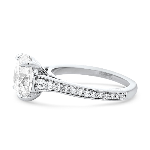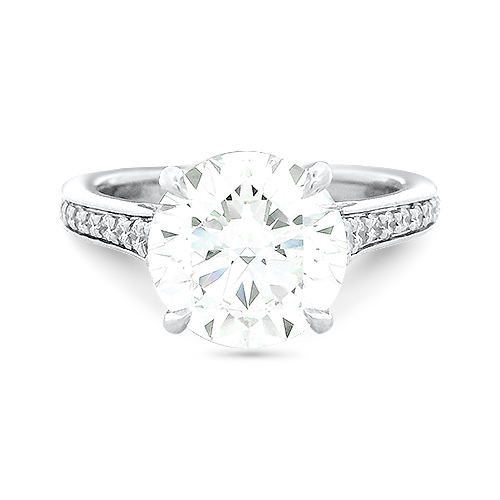 This platinum engagement ring features a single 3.50ct ideal cut round brilliant diamond (graded by the GIA to have a J color and VS2 clarity) set with a graduated, flush-fit diamond shank (26 round diamonds totaling 0.30ctw). This diamond will come with its original GIA lab report after purchase. The perfect engagement ring for the tradiational bride.