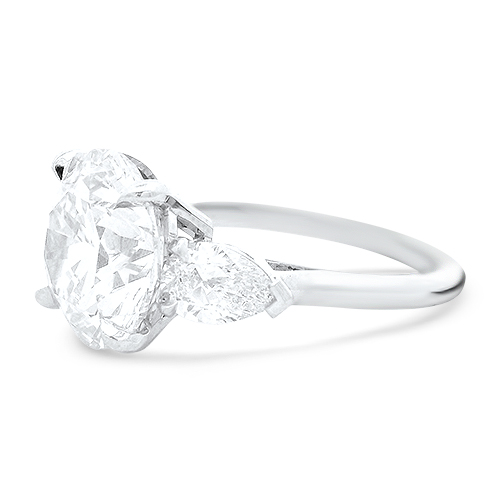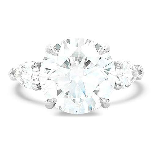 This platinum engagement ring features a center 5.06ct round brilliant diamond accented by two pear shape diamonds totaling .81ct. The center stone has been graded by our in house certified gemologist to have an excellent cut grade, J color and SI1 clarity.