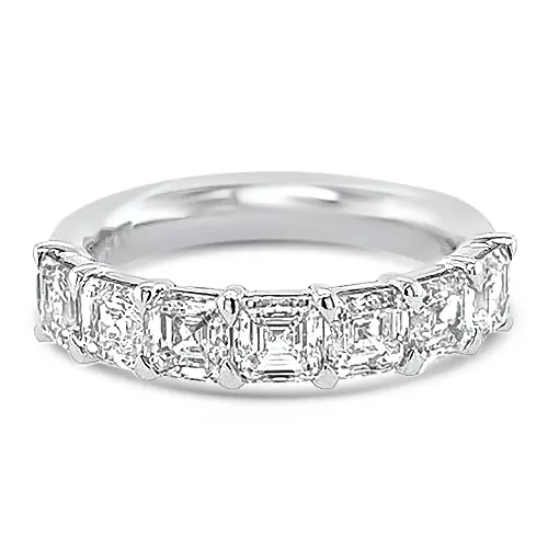 This platinum wedding band features seven asscher cut diamonds totaling 2.34ctw in a buttercup shared prong band.