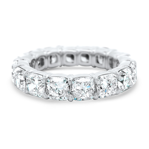This platinum diamond eternity band features 16 cushion cut diamonds totaling 6.58ctw. They have been graded by our certified gemologist to have G colors and VS1 to SI1 clarities.
