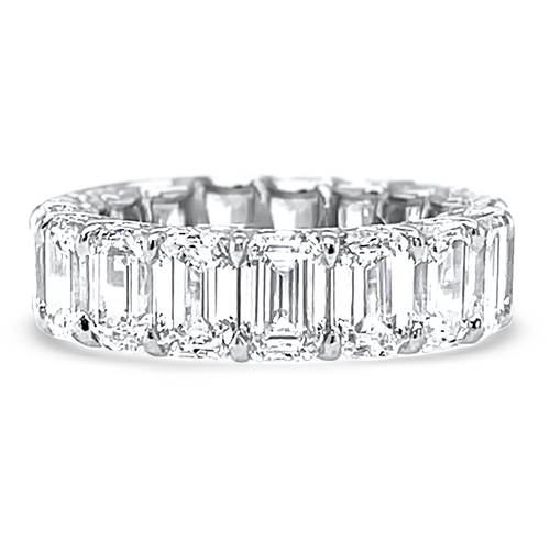 This statement-making 18kt white gold diamond eternity band ring features 17 emerald cut diamonds (totaling 8.65ctw) matched in shape and color (from D to F color range), have been graded by the Gemological Institute of America and come with their GIA reports.
