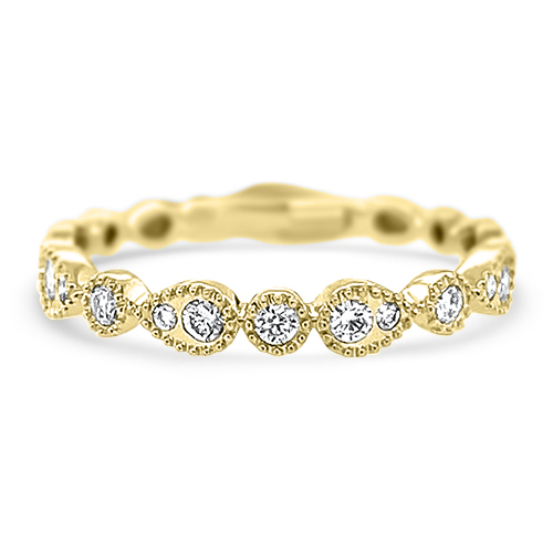 This 14kt yellow gold band ring features 11 milgrain-detailed bezel-set diamonds totaling 0.14ctw.