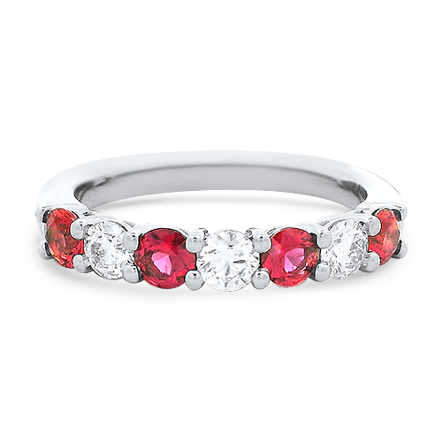 This dazzling platinum wedding band features three round brilliant diamonds totaling .45ctw and four red rubies totaling .72ctw.