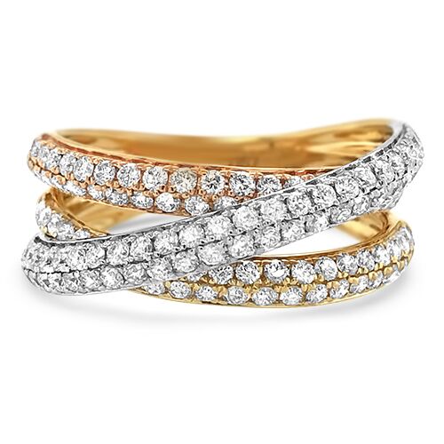 This 14kt tri-color gold ring featues three bands of pave diamonds, 125 round diamonds totalling 1.18ct, that cross over the each other, creating a beautiful right-hand ring. Perfect for someone who wants to work in the beauty of rose, yellow and white gold, along with plenty of diamond brilliance, all in one piece.