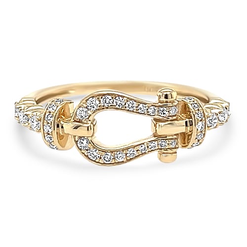 Perfect for the rodeo or a night out, this 14kt yellow gold diamond stirrup ring features 38 round brilliant diamond totaling .17ctw.
