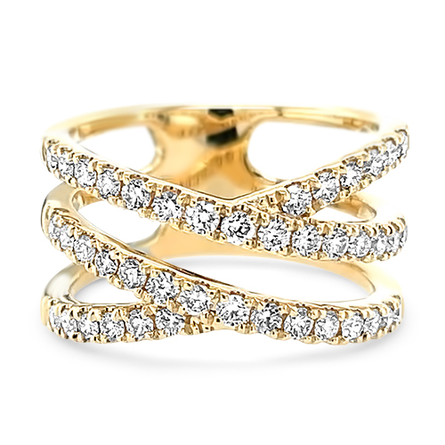 This 14kt yellow gold ring features 4 rows of diamonds in a modern, crossover-style wide band. With 42 round brilliant diamonds, totaling approximately 0.80ctw, this ring makes the perfect right hand statement!