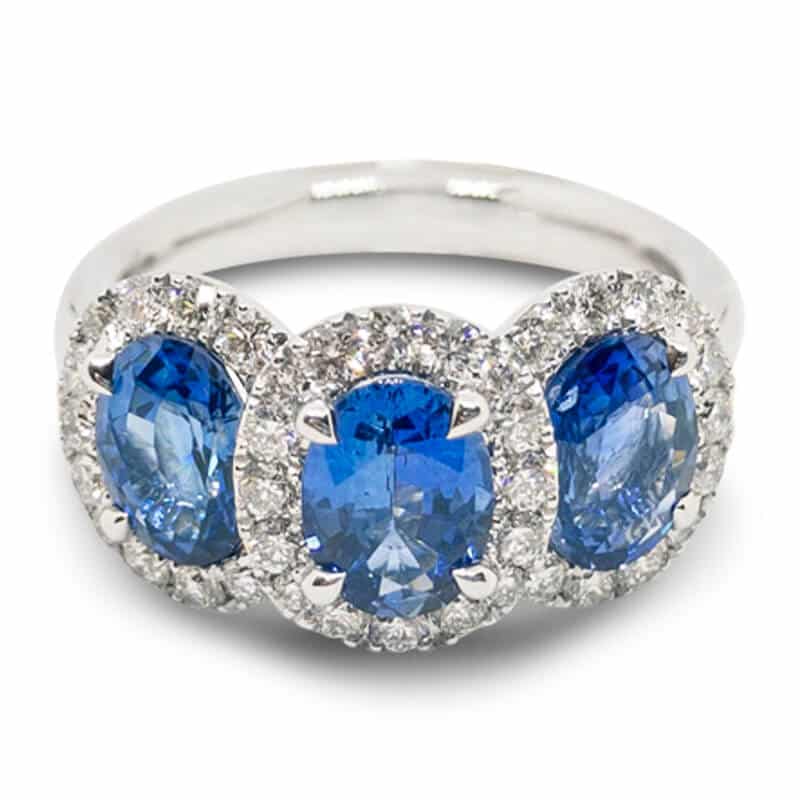 This 18kt white gold blue sapphire three stone ring features 3 oval sapphires, totaling approximately 2.50ctw, surrounded by 3 diamond halos of 38 round brilliant diamonds totaling 0.58ctw, and is a ring size 6.5.