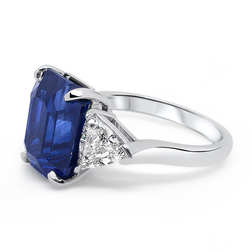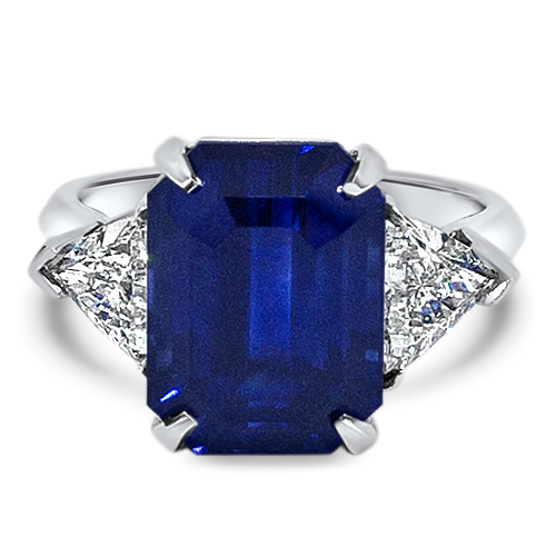This hand-made platinum ring features a center 8.22ct Vivid Blue Emerald cut Sapphire and two Trillion cut Diamonds (totalling 1.15ct and graded by our in house AGS and GIA-certified Gemologist to have G colors and SI1 clarities) flanking the left and right sides. A truly one-of-a-kind, statement-sized Sapphire mounted in a carefully crafted, unique platinum ring for maximum beauty and durability. This ring will be a show-stopper for the fortunate woman who has the pleasure to wear it!
