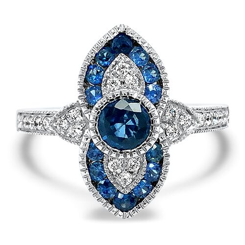 14kt. white gold vintage inspired sapphire and diamond ring. This gorgeous antique style elongated ring features blue sapphires at .76ctw and diamonds at .14ctw. This ring features milgrain edges on the metal.