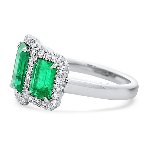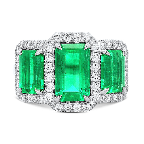 This gorgeous platinum ring features three matched emerald cut Columbian emeralds accented by diamond halos totaling .49ctw.