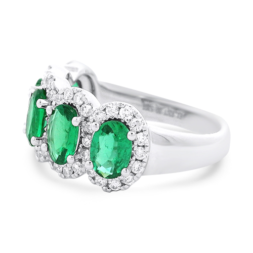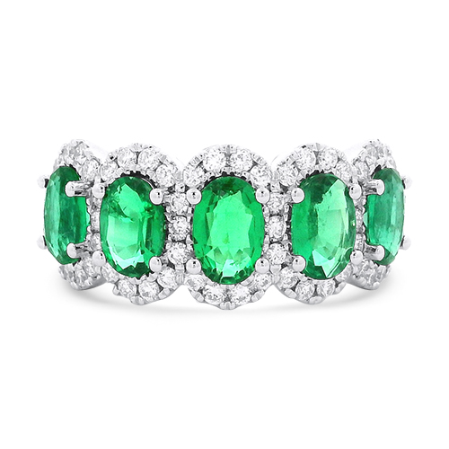 This beautiful 14kt white gold band features five oval green emeralds totaling 1.92ctw accented by diamond halos totaling .52ctw.