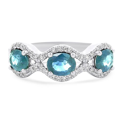 This 14kt white gold ring features three round blue sapphires accented by diamond halos totaling .16ctw.