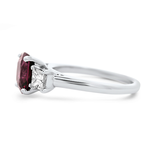 Make a statement with this beautiful 14kt white gold ring featuring a center cushion shape 2.31ctw rhodolite garnet accented on either side by a radiant square diamond totaling .65ctw.