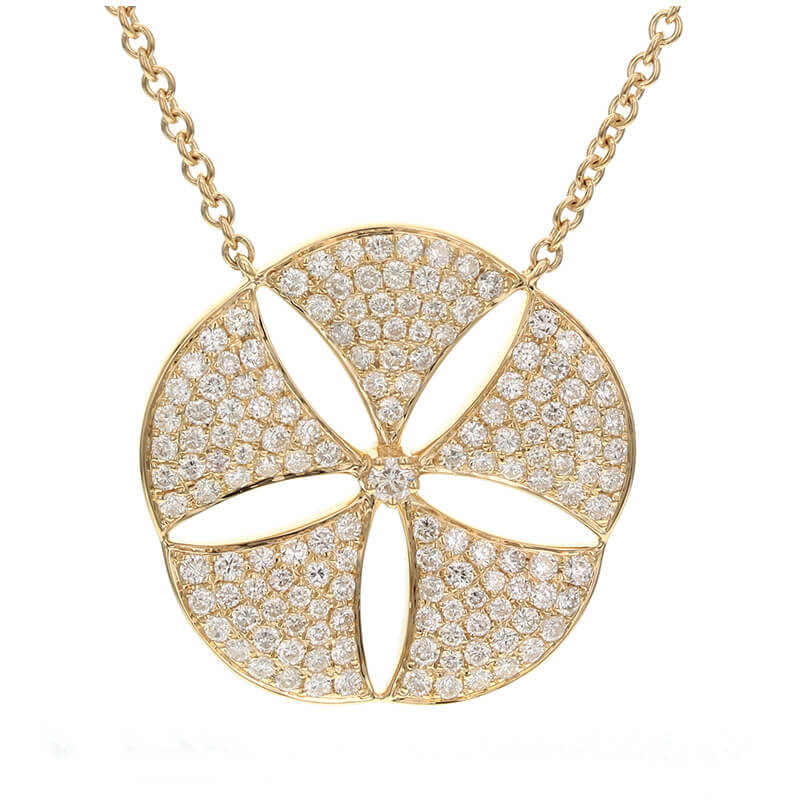 18KT Yellow Gold pave diamond sand dollar necklace with 151 diamonds at 1.30ctw. It hangs on a 16 inch yellow gold chain.