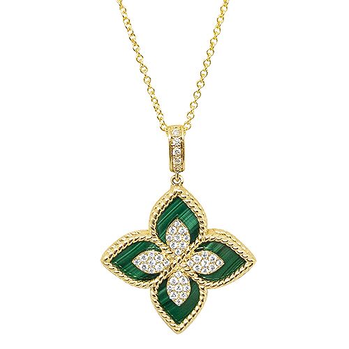 This 14 karat yellow gold malachite pendant features a floral shape with diamonds in the center of the flower and is hanging from a 16″ gold chain.