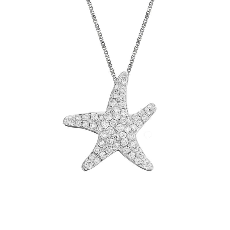 14K WG 18 inch Necklace. 21mm (length) diamond starfish pendant with hidden bail on 0.8mm Diamond-Cut Box chain with lobster clasp. 55 round full-cut diamonds totaling 0.70ct. Prong-set.