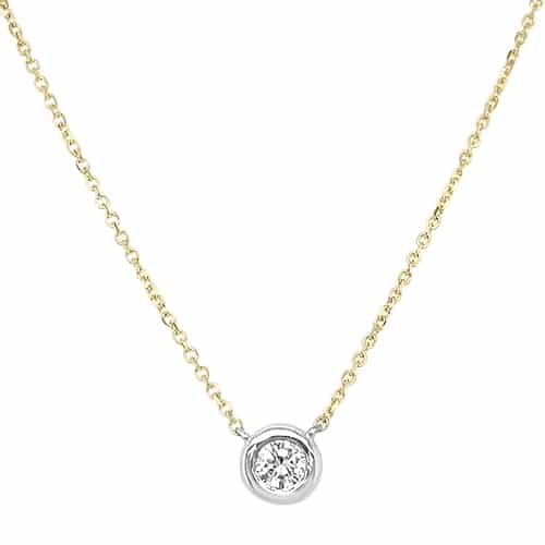 This 14kt two tone gold pendant features a .21ctw bezel set diamond solitaire on a 18″ 14kt yellow gold chain.