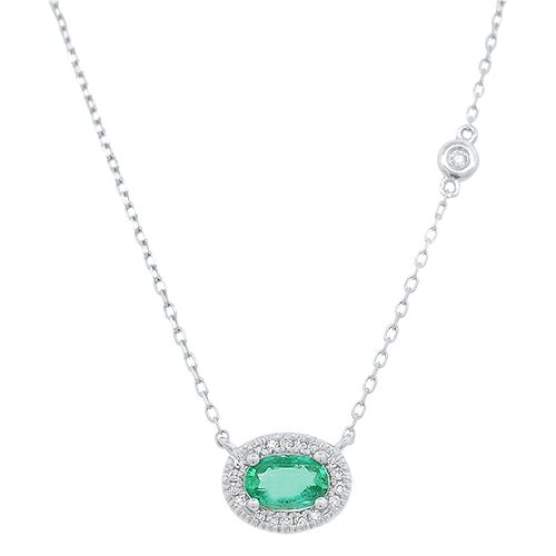 This 14kt white gold necklace features a center oval emerald encompassed in a halo of diamonds totaling .08ctw and measures 17″ in length.