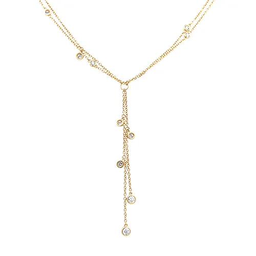 This 18kt yellow gold necklace features a double chain accented by dangling diamonds totaling .14ctw and measures 17″ in length.