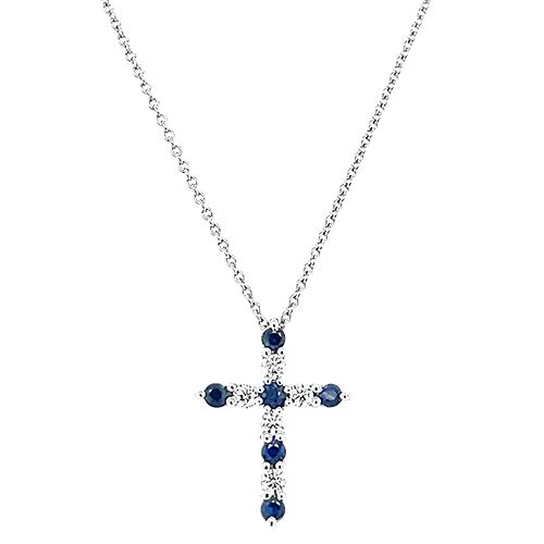 This 14kt white gold cross pendant features 5 round brilliant diamonds alternating with 6 round sapphires (all totaling 0.25ctw) and hangs from an adjustable 16-17-18 inch pendant chain.