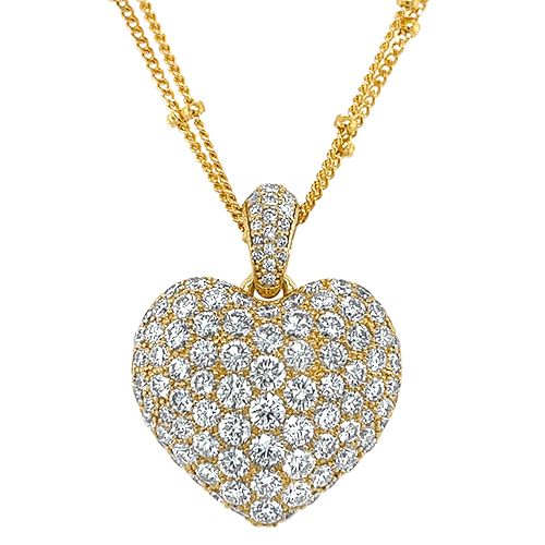 This gorgeous 18kt yellow gold necklace features a pave diamond heart and bale totaling 2.80ctw and measures 17″ in length.
