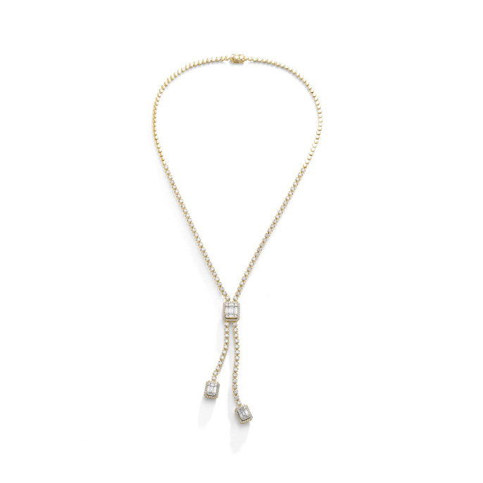 Strikingly elegant and endlessly versatile, this 18KT yellow gold diamond line necklace embodies refined sophistication with a contemporary edge. The graceful Â’YÂ’ drop design showcases a stunning combination of baguette-cut and round brilliant diamonds, totaling 6.75 carats with 1.30ctw in baguette diamonds and 5.45ctw in round diamonds.